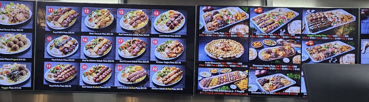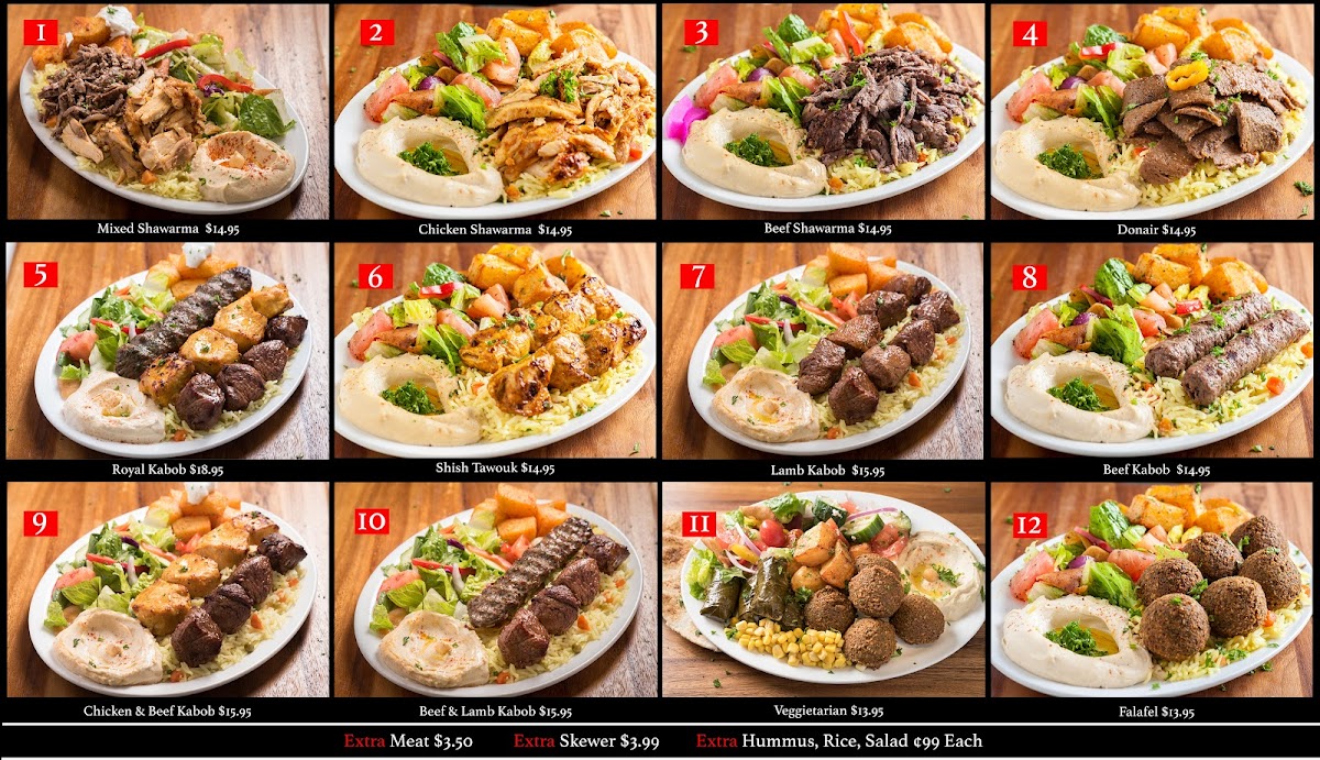 Comes with Three Skewers of Kabab (Beef Kabab Tenderloin, Shish Tawouq & Lamb Kabab) Served with Fatoush Salad, Garlic Potato,Basmati rice, Hummus and Garlic Sauce